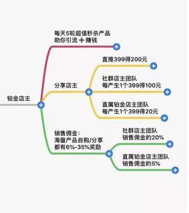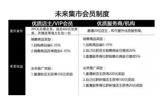关于发展新会员的运营模式,未来集市有一套详细的“激励”规则。本刊记者在一个350人的黄金管家微信群里看到一份材料,里面详细列明了不同“等级”店家的收益情况。其中,黄金管家每推广1名新店主入驻,即可获得“奖励”100元;推广黄金管家人数一旦超过20人,即晋升为铂金管家,铂金管家每推荐一个新店主入驻开始可以赚200元。同时升级优质服务商,不仅自己招一个店主赚200元,同时店主再邀请的店主还可以赚100元,他们在未来集市里面购买任何东西都和自己有关系。自己买东西和分享链接别人买东西都可以拿6%到35%的佣金;同时,这些新店主还可以去继续招募,一层一层下线累积起来,整个“团队”招募的新店主规模超过750人,“铂金管家”便可再次升级为“钻石管家”, 可以参与未来集市1%的业绩分红。