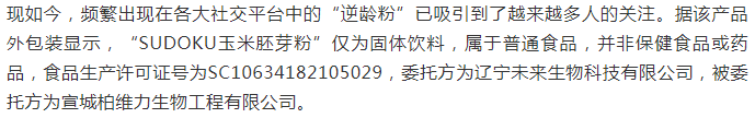 2021年9月30日,未来生物新零售官方发布《关于公司规范经营的最新声明》,《声明》指出:近期市场上出现了以“神仙逆龄粉”、“逆龄粉”等名称过度神话未来生物部分产品的现象,对此,公司再次重申,销售过程必须遵守未来生物多年来一贯坚持的原则,即不滥用溢美之词,不滥用违反科学规律的案例。尽管《声明》明确要求经销商禁止虚假宣传有关产品的功效,然而,进入2021年10月之后,涉及到相关产品的虚假宣传之音在网上仍显得十分刺耳。据了解,《声明》中提到的“逆龄粉”的真实名称为“SUDOKU玉米胚芽粉”,这款产品也是目前未来生物新零售商城中的报单产品。