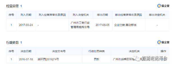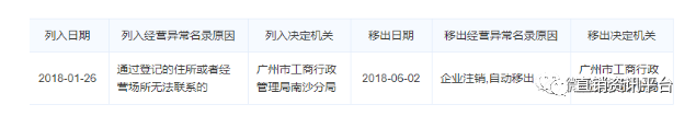 很巧的是,广州市全嘉餐饮有限公司直到注销之时,也一直处于广州市工商行政管理局越秀分局列入的经营异常名录之内。