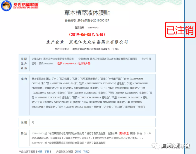 国家药品监督管理局官网显示,圣道康膜的实际备案名称为“草本植萃液体膜贴”,在备注一栏中,反传防骗联盟留意到该产品于2018年12月13日被责令改正,原因为“产品名称缺商标名:活络康膜;宣称治疗功效:活络;上传的产品包装图片信息标注不全或不清晰”。2019年6月5日,该产品(备案编号:黑G妆网备字2018000127)已注销。