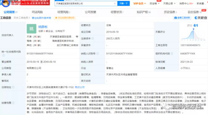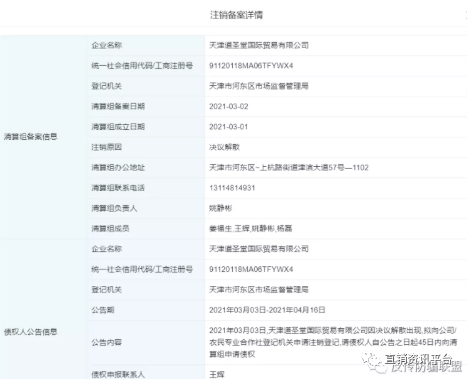 2021年3月1日,天津道圣堂国际贸易有限公司向天津市河东区市场监督管理局申请注销,注销原因是“决议解散”,据天眼查显示,天津道圣堂公司于2021年4月21日已正式注销。