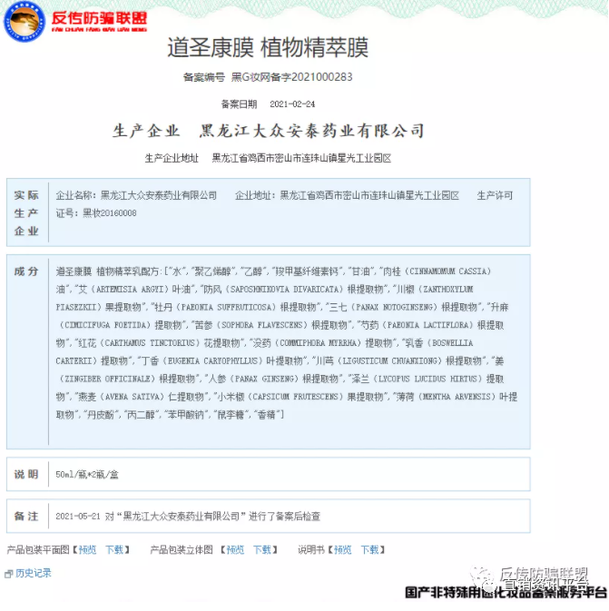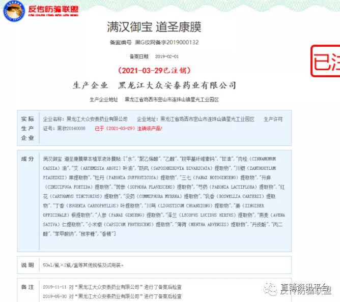 2020年上半年,黑龙江大众安泰药业有限公司又备案了三款与道圣康膜有关的产品,分别是“满汉御宝 道圣康膜”(备案编号:黑G妆网备字2019000132)、“满汉御宝 道圣康膜”(备案编号:黑G妆网备字2020000704),以及“满汉御宝 道圣康膜(Manhanyubao,Daoshengkang Cream)”(备案编号:黑G妆网备字2020000444)。经国家药品监督管理局官网显示,目前这三款产品也均于2021年3月29日注销。