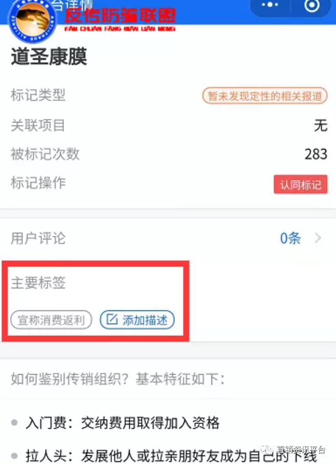 据腾讯平台的灵鲲金融风险查询举报中心平台显示,道圣康膜平台目前的标记类型虽是“暂未发现定性的相关报道”,但其主要标签有“宣称消费返利”的字样,被标记次数为283次。