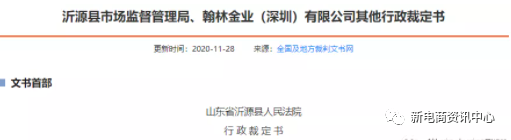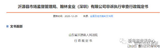 时隔一天,2020年12月23日,《沂源县市场监督管理局、翰林金业(深圳)有限公司非诉执行审查行政裁定书》生效。