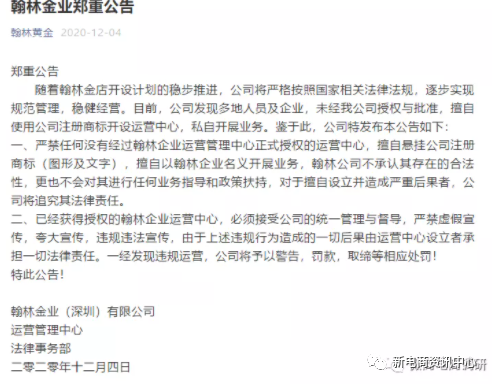 2020年12月4日,翰林黄金官方公众号发布公告: