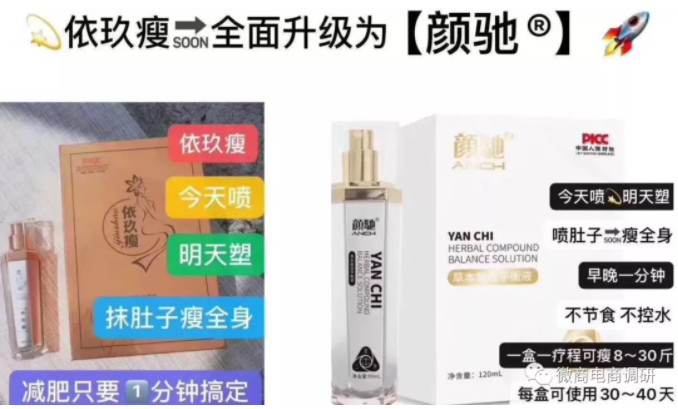 在前文中,我们得出了颜驰是潮约前身的结论,而事实上,颜驰也有前身,其名为“依玖瘦”,在更名阶段,也有经销商声称颜驰就是依玖瘦的升级版。