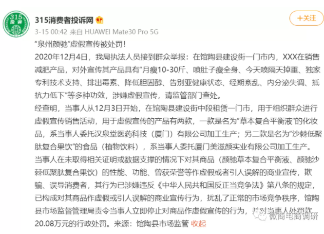 除了资金冻结事件,围绕着颜驰生物传出的虚假宣传事件也颇为引人注意,据“馆陶县市场监管”发布的消息显示: