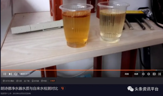 值得一提的是,在某视频网站上,我们还看到了一则关于朗诗德的“水质电解实验”的视频。