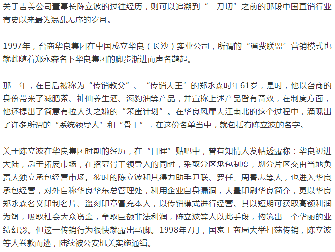 在本篇报道中,我们简单地了解到了吉美公司的发展历程,以及董事长陈立波的过往遭遇,在下篇报道中,我们将重点关注的是被推广人员夸大宣传的“吉美磁化水器”是一款怎样的产品,在第三篇报道中,我们所将关注的是吉美公司的奖金制度有何特色,以及围绕着吉美公司在近几年里传出来的投诉之声,请继续关注本网。