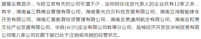 陈立波名下的湖南立鸿新能源有限公司目前已连续多年被有关部门列入到了企业经营异常名录当中。