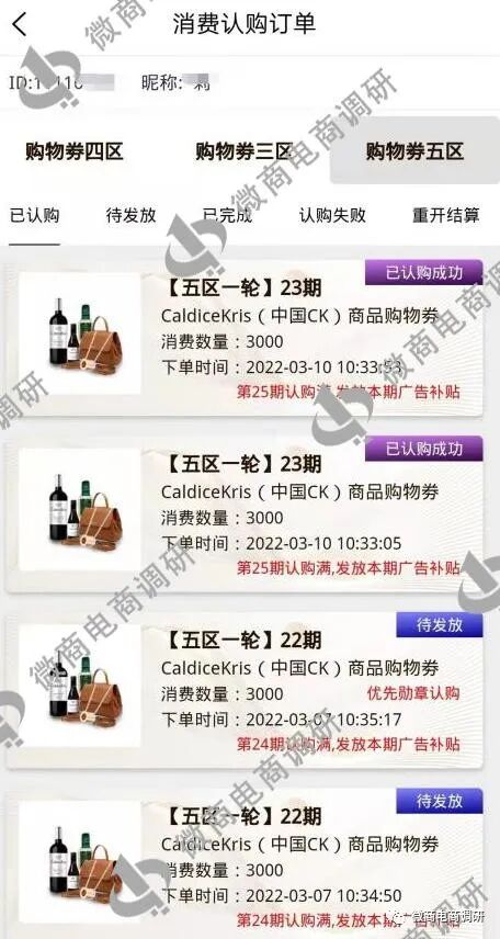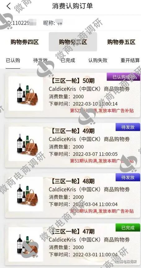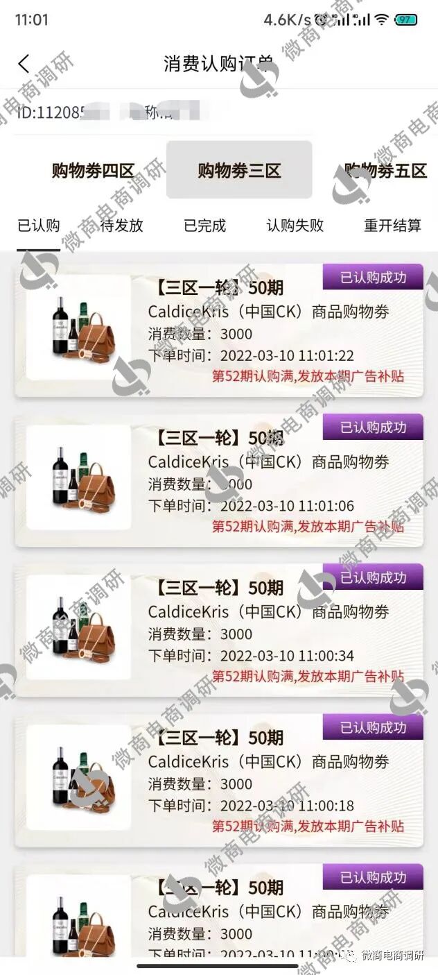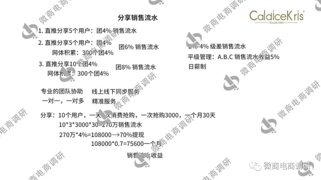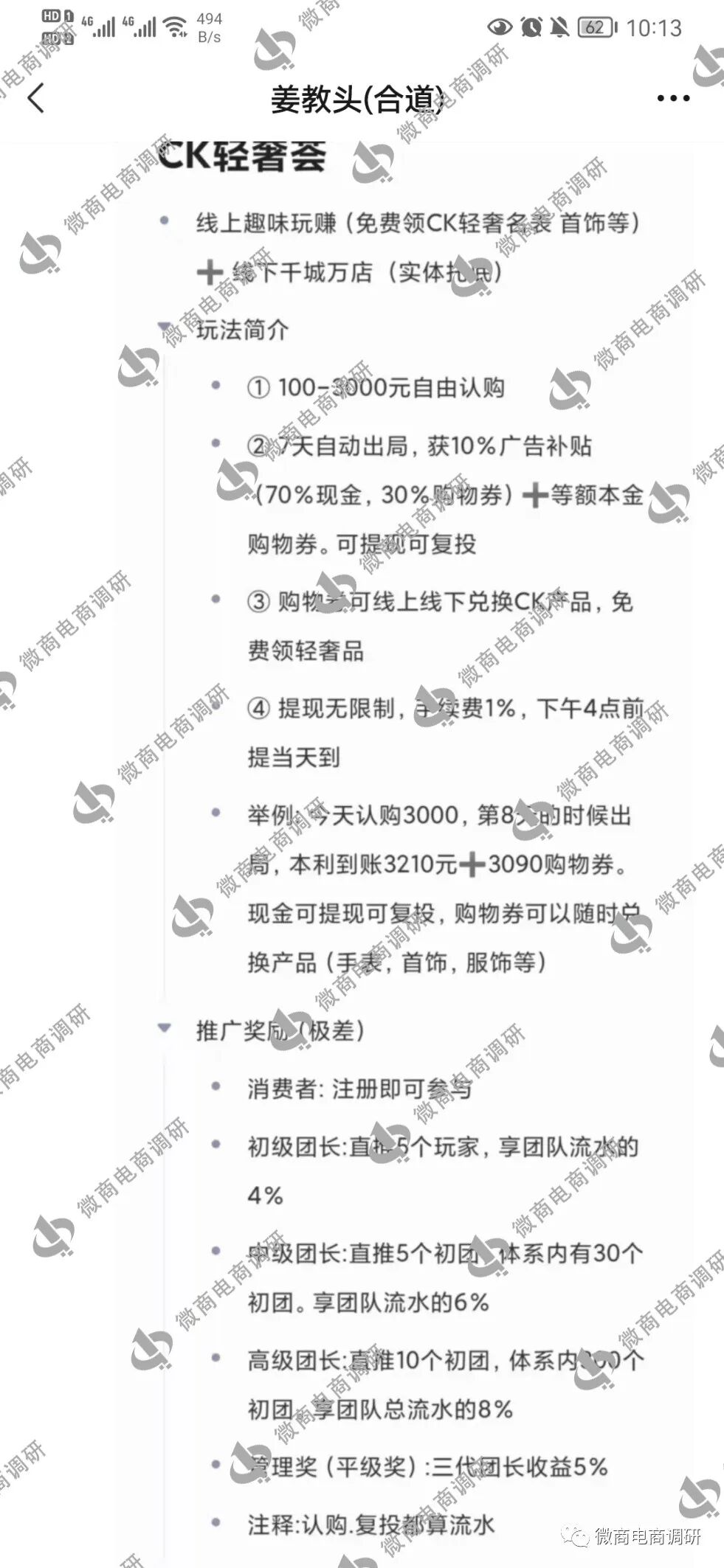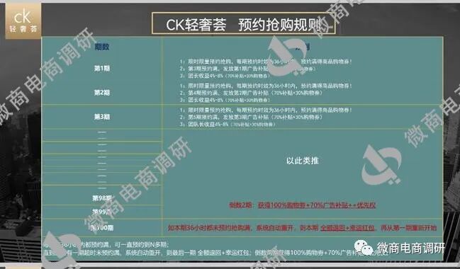 从代理商处得知,CK轻奢荟采取的是四级分销的销售模式,四个级别分别是消费者、初级团长中级团长、高级团长。