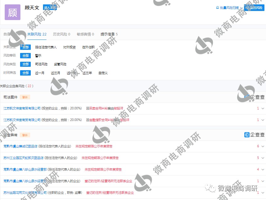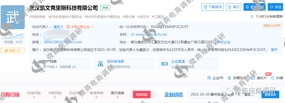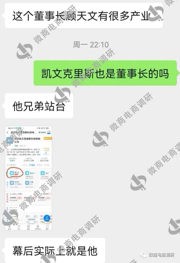 微商电商调研从代理处了解到,CK轻奢荟的主体公司是武汉凯文克里斯科技有限公司,该公司成立于2021年10月9日,法定代表人为潘圣才,监事吴娟,大股东顾天发,注册资本为1219万元,实缴资本未知,企业地址位于湖北省武汉市江夏区。