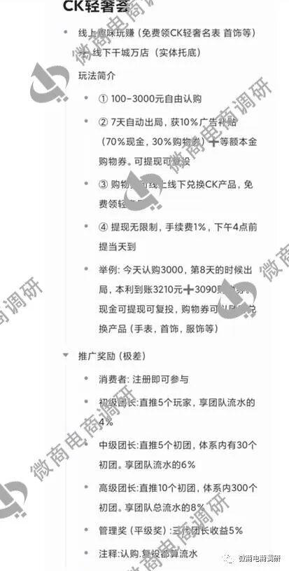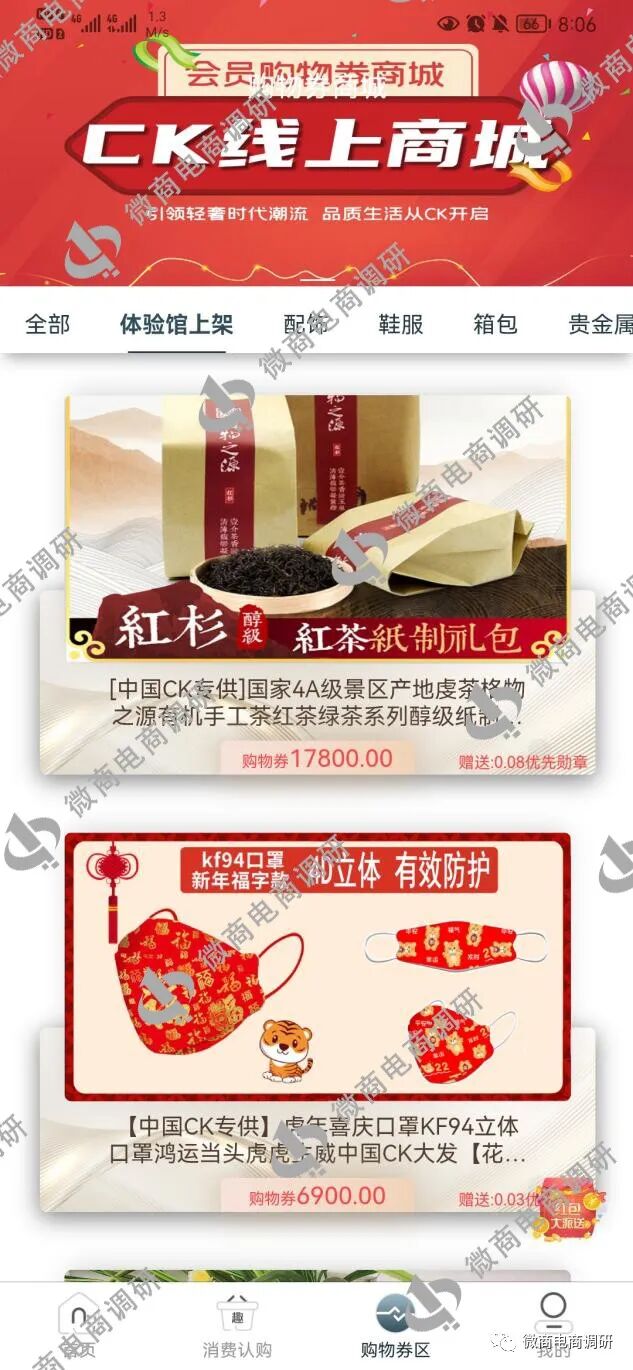 一个名叫“中国CK”的品牌,旗下有一款名叫CK轻奢荟的APP,代理宣传是由中国CK倾力打造的新经济商城平台,采用“线上APP+线下体验馆”的模式进行推广。