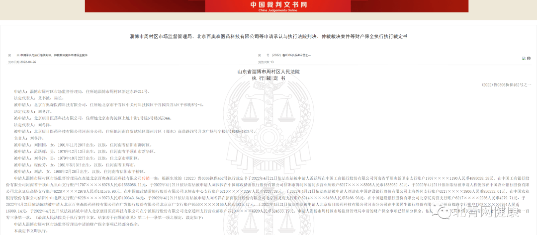 此外,另外一则题为《淄博市周村区市场监督管理局、北京百奥森医药科技有限公司等申请承认与执行法院判决、仲裁裁决案件等财产保全执行执行裁定书》(简称:《执行裁定书》)。