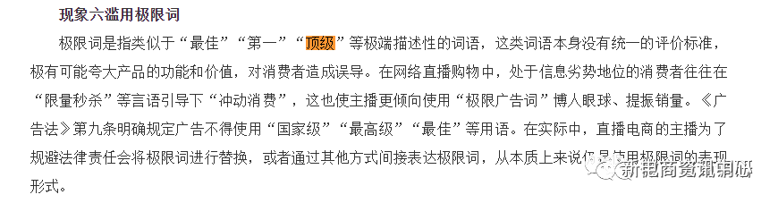 而早在2020年,《中国消费者报》已明确指出“顶级”等词语属于极限用词,显然,这样的宣传涉嫌违反了我国《广告法》关于禁止使用绝对化用语的规定。众所周知,商品或服务优劣均为相对的,具有地域和时间阶段的局限,在广告中使用最高级、绝佳、顶级等语言,违背了事物不断发展变化的客观规律,容易误导消费者,也会造成商家之间的不正当竞争。