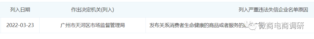 虽然该公司早就有了注销的打算,但截至目前仍处于开业的状态,并且在申请注销四个月后的2022年3月,无限畅公司就因发布关系消费者生命安全的商品或服务的虚假广告,被广州市天河区工商行政管理局列入到了严重违法失信企业名单。