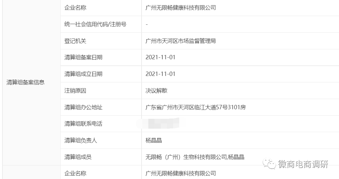 知明公司原名无限畅(广州)生物科技有限公司,2022年后才完成更名。有意思的是,在母公司更名前,子公司广州无限畅健康科技有限公司早在2021年11月竟然就已进入了注销流程,公示为“决议解散”。