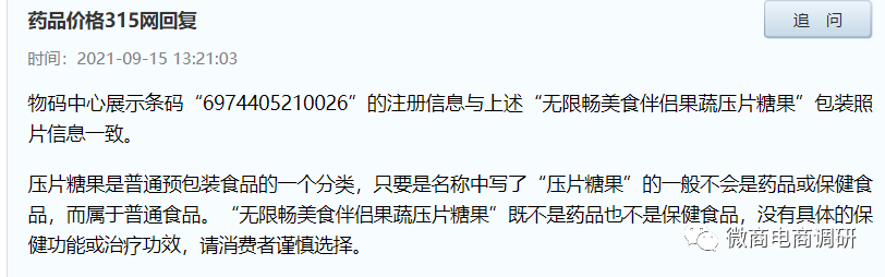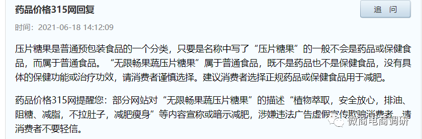 此前,药品价格315网在接受关于该产品的咨询时也曾明确指出:压片糖果是普通预包装食品的一个分类,只要是名称中写了“压片糖果”的一般不会是药品或保健食品,而属于普通食品。“无限畅美食伴侣果蔬压片糖果”既不是药品也不是保健食品,没有具体的保健功能或治疗功效,请消费者谨慎选择。