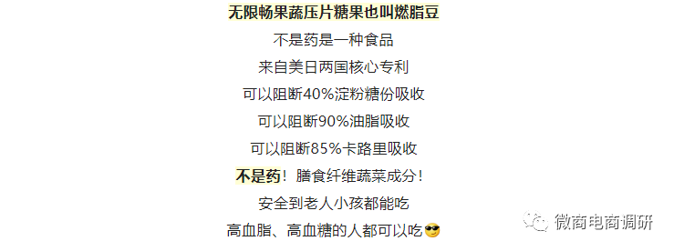为了进一步达到招商目的,公众号“无限畅果蔬压片燃脂豆招商总部”更是特别指出:无限畅果蔬压片糖果可阻‬断40%淀粉糖分‬吸收、可阻‬断90%油脂吸收、可阻断85%卡路里吸收。而根据我国《广告法》第十条规定,广告使用数据、统计资料、调查结果、文摘、引用语,应当真实、准确,并表明出处。不过显而易见的是,该公众号在晒出这些数据时,并未表明出处。