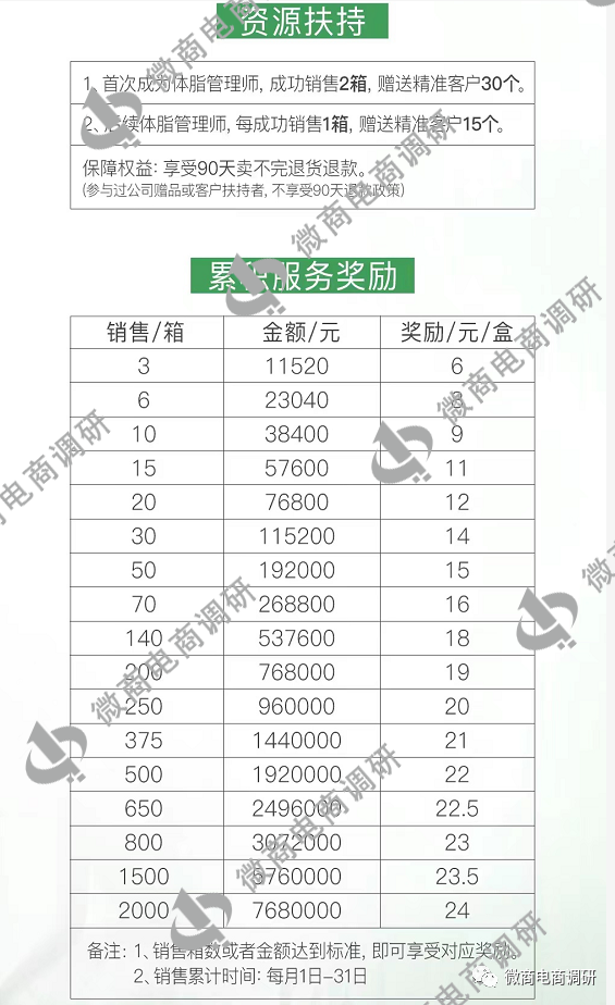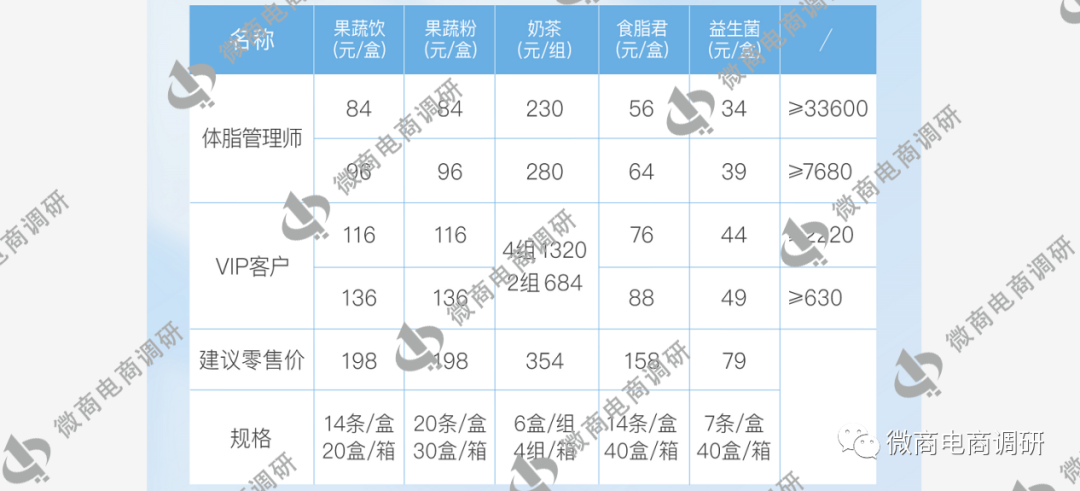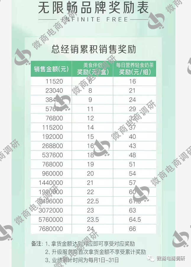 接下来,我们再来关注一下轻代码推行的奖金制度该如何解读。据推广人员介绍,轻代码将代理商主要分为三个级别,分别是VIP、总经销和服务商,后面两个级别统称为“体脂管理师”。不同级别对应的拿货价自然不同,我们以“轻代码果蔬饮”为例,一盒产品的零售价为198元,VIP有两个门槛,门槛一是630元,拿货价是136元;门槛二是2220元,拿货价是116元;总经销门槛是7680元,拿货价是96元;服务商门槛是33600元,拿货价是84元,其中的差价收益肉眼可见。(门槛和无限畅时期一模一样)