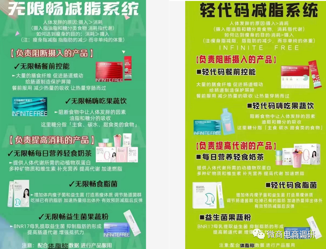 几个月前,无限畅这个品牌已经正式更名为了“轻代码”,但销售的依然是普通食品,宣传的也依然是涉及到减肥、减脂的保健功效,哪怕是在景甜事件发生后的当下,关于轻代码产品所具功效的种种表述依然是换汤不换药。代理商阿青(化名)也明确表示无限畅和轻代码旗下的所有产品都是普通食品,在如今轻代码这个系统当中,只有轻代码的产品,没有无限畅的产品,轻代码产品是无限畅产品的配方升级版。