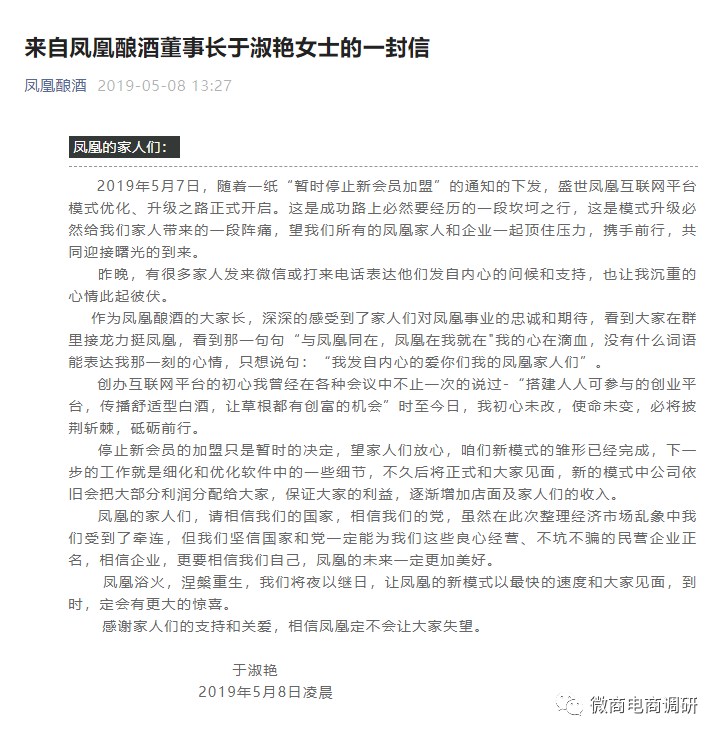 微商电商调研从凤凰酿酒公众号,找到一封凤凰酿酒董事长于淑艳写给“家人们”的信。信中提到,盛世凤凰已经“暂时停止新会员加盟”,并正式开启模式优化、升级之路。信中还透露,新模式的雏形将完成,将细化和优化软件中的一些细节,不久后将正式和大家见面。