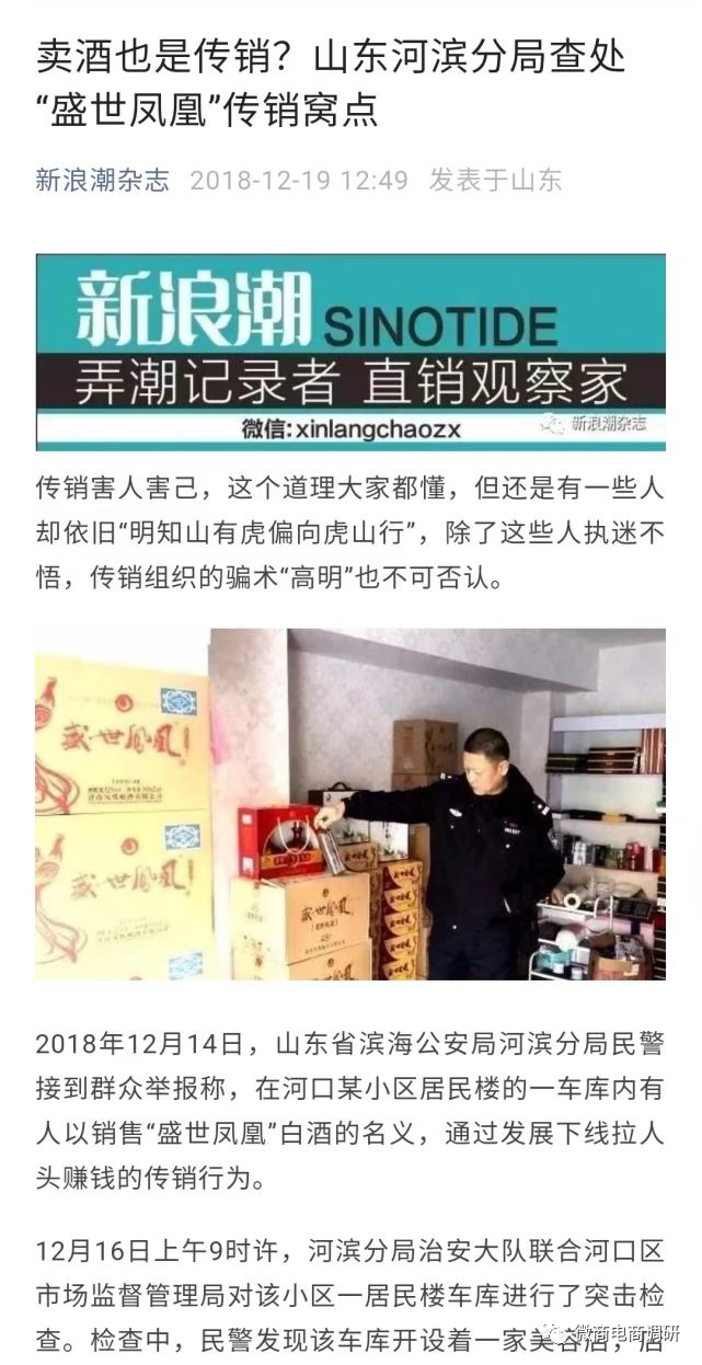 据新浪潮杂志的报道,2018年12月14日,山东省滨海公安局河滨分局民警接到群众举报称,在河口某小区居民楼的一车库内有人以销售“盛世凤凰”白酒的名义,通过发展下线拉人头赚钱的传销行为。