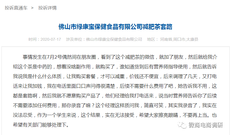 而与其曾经有过合作关系的绿康宝保健食品有限公司,也受到众多投诉。对于网友们所说的“佛山市绿康宝保健食品有限公司减肥茶套路”,微商电商调研将持续保持关注。