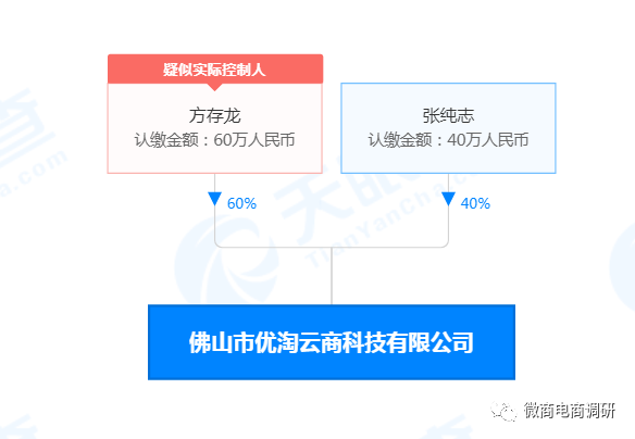 天眼查信息显示,佛山市优淘云商科技有限公司成立于2016年11月22日,注册资金100万元,法定代表人为方存龙,同时为公司大股东,持股比例为60%;另外一名股东为张纯东,持股比例为40%;经营范围包括软件开发;信息系统集成服务;数据处理和存储服务;信息技术咨询服务;营养和保健品零售;互联网零售(法津、行政法规或者国务院决定禁止和规定在登记前须经批准的项目除外);贸易代理。