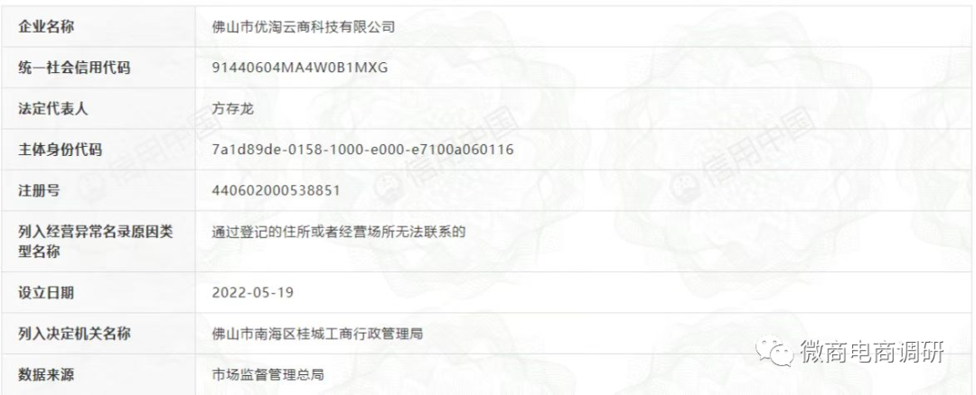 信用中国信息显示,佛山市优淘云商科技有限公司已经于2022年5月19日被佛山市南海区桂城工商行政管理局列入经营异常名录,原因类型是“通过登记的住所或者经营场所无法联系的”。