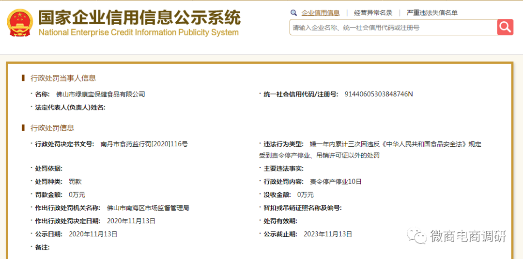 除了众多投诉之外,微商电商调研还从国家企业信用信息公示系统查询到,绿康宝保健食品有限公司曾一年内累计三次因违反《中华人民共和国食品安全法》规定,被佛山市南海区市场监督管理局责令停产停业10日。