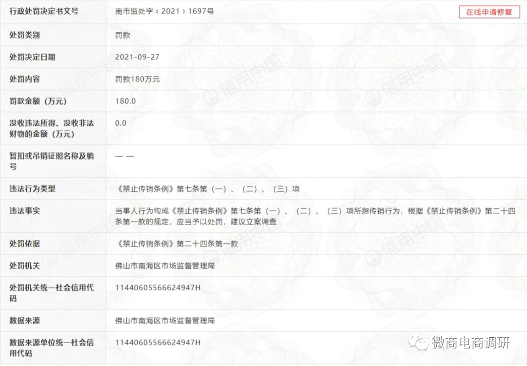 据微商电商调研了解,优淘云商科技成被执行人或与此前信用中国上的一则行政处罚信息有关。处罚信息显示,佛山市优淘云商科技有限公司因涉嫌传销被罚款180万元。
