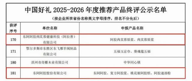 近日,中国国际贸易促进委员会商业行业委员会在浙江杭州召开中国好礼产业促进计划2025—2026年度推荐产品终评会。东阿阿胶股份有限公司(以下简称“东阿阿胶”)四大主产品东阿阿胶、复方阿胶浆、桃花姬阿胶糕、阿胶速溶粉及旗下肉苁蓉健康科技(阿拉善)有限公司的阿胶肉苁蓉原浆、肉苁蓉原浆等共计六款产品,在全国超5000款产品中脱颖而出,成功入选“中国好礼2025-2026年度推荐产品”名单。