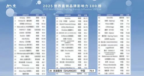 在本届新消费品牌节上,世界直销研究院联合帝瑞研究院、中国世界贸易组织研究会直销研究专业委员会联合发布了《世界直销品牌影响力100榜》。双迪位列第39 位。此榜单通过对过去一年全球直销企业的数据调研,并邀请国内外直销专家和资深从业者,从战略引领力、品牌经营力、组织管控力、科研创新力、全球拓展力等五个层面对全球直销企业展开综合评估。