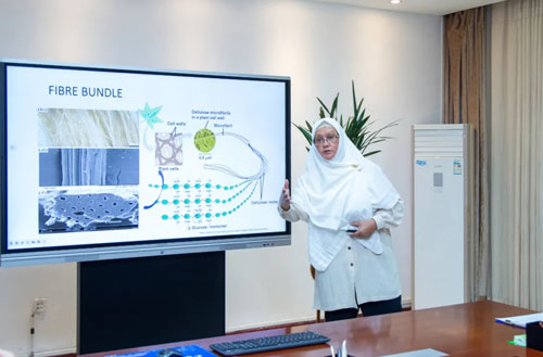 萨拉尼·宾特·扎卡里亚教授讲述了自己的成长历程,并做了精彩的科研报告。萨拉尼•宾特•扎卡里亚教授重点介绍了自己的重点科研成果——纤维素先进材料中的水凝胶。通过湿纺工艺再生纤维素纤维,以及基于介电泳的混合编织纤维素胶原生物支架智能快速伤口愈合器的原理研究与设计,展示了其在生物材料领域的深厚造诣和前沿探索。