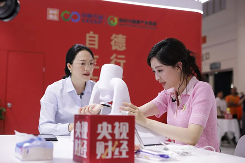 ▲21日,央视财经主持人郭若天走进新时优品展区,体验公司健康服务设备