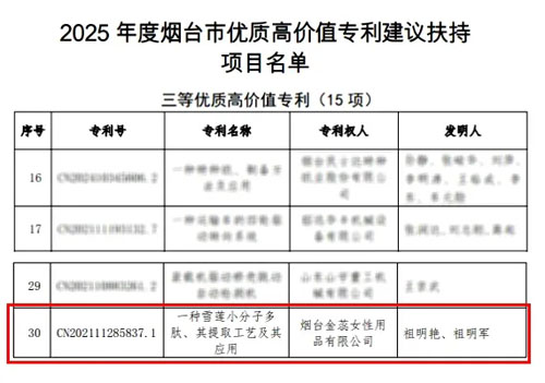近日,金天国际申报的《一种雪莲小分子多肽、其提取工艺及其应用》专利,凭借高创新性、稳定权利状态及市场竞争力,获得2025年度烟台市高价值专利建议扶持项目“三等优质高价值专利”殊荣。