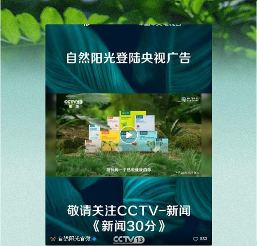 自然阳光登上央视屏幕 讲述“严肃营养”故事