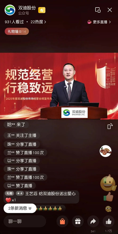10月17日,双迪外事部开展的《规范经营 行稳致远》主题直播,作为本次宣传月的线上核心阵地,取得了显著成效。单场直播即吸引近千人次观看,收获1.7万次点赞与超300次分享,充分体现了市场伙伴对合规知识的高度关注与认可。同时,在公司自媒体平台持续释出培训集锦、经销商宣言视频等多元化内容;双迪终端管理部深入解读经销商守则,多管齐下,将规范意识生动融入日常运营的每一个场景。