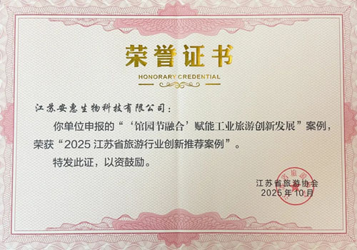 近日,由江苏省旅游协会主办的“2025江苏旅游业高质量发展主题活动”于盐城东台黄海森林公园开启。活动上,安惠“‘馆园节融合’赋能工业旅游创新发展”案例成功入选“2025江苏省旅游行业创新推荐案例”。