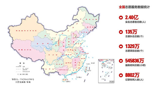 根据国家民政部下属的中国志愿服务网的数据显示,目前我国实名注册的志愿者总数达到了2.40亿人,志愿者队伍总数达到135万,志愿项目总数达到1329万,志愿服务时间总数达到54.58亿小时。