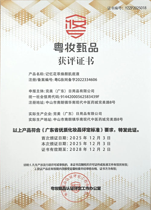 大会以“品创粤妆、星耀美湾”为主题,第四届“粤妆甄品”获评名单于现场正式揭晓。完美公司的记忆花萃焕颜肌底液参与了本年度“粤妆甄品”的评定,其凭借优秀和高效的产品原料以及强大的创新实力,在众多参赛产品中脱颖而出,荣获2025年度“粤妆甄品”荣誉称号,为完美公司在美妆领域的卓越表现再添光彩。