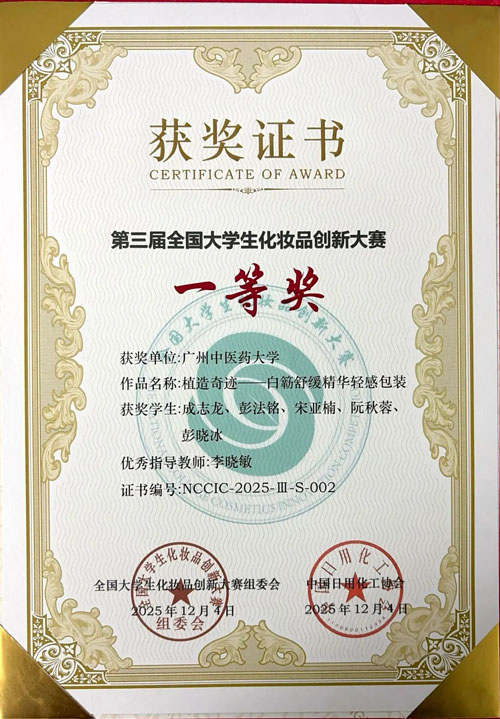 完美(中国)有限公司(以下简称“完美公司”)与广州中医药大学联培研究生的参赛项目《植造奇迹——白簕舒缓精华轻感包装》斩获第三届全国大学生化妆品创新大赛“一等奖”,研发中心总经理李晓敏荣获“优秀指导教师”称号。这一成果既是校企协同培育创新人才的生动例证,更彰显了完美公司在科技转化、绿色可持续发展领域的行业引领力。