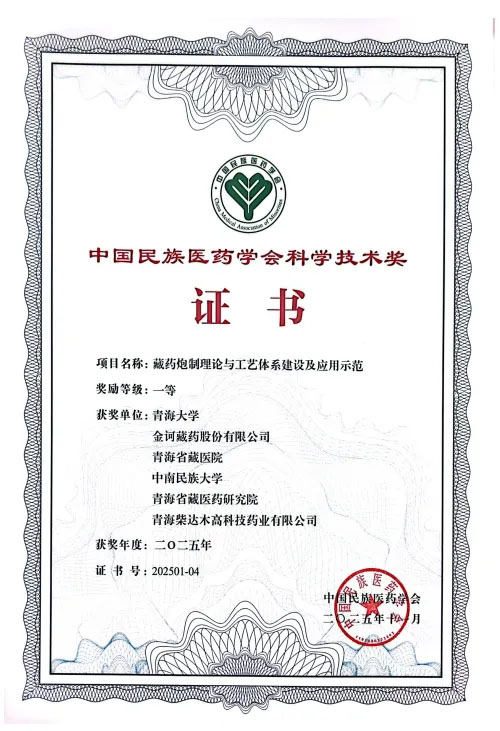 近日,中国民族医药学会正式公布2025年度科学技术奖获奖名单,由青海大学牵头,金诃藏药股份有限公司作为核心完成单位共同参与的 “藏药炮制理论与工艺体系建设及应用示范”项目荣获科学技术奖一等奖。这一国家级奖项的获得,标志着金诃在藏药炮制标准化、产业化协同创新方面取得重要突破,彰显了企业“产学研用”深度融合的创新实力。