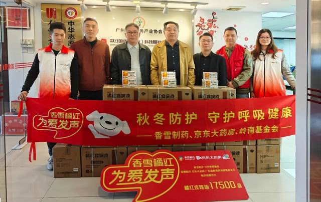 本次活动由香雪制药联合京东大药房、广东省岭南教育慈善基金会共同发起,共计17500盒香雪橘红痰咳液爱心物资将定向发放至广州市内多个社区及养老院,旨在为长者的秋冬呼吸健康构筑一道坚实屏障,助力他们抵御疾病侵袭。