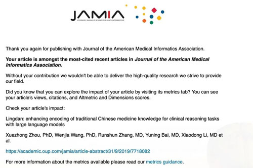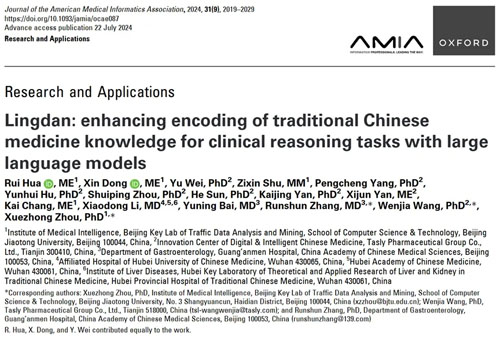 近日,天士力数智中医药团队发表在国际权威期刊《美国医学信息学协会杂志》的论文《Lingdan: enhancing encoding of traditional Chinese medicine knowledge for clinical reasoning tasks with large language models》,成为该刊近期被引用次数最多的文章之一,标志着中医智能化研究已获国际学术界广泛关注与认可。
