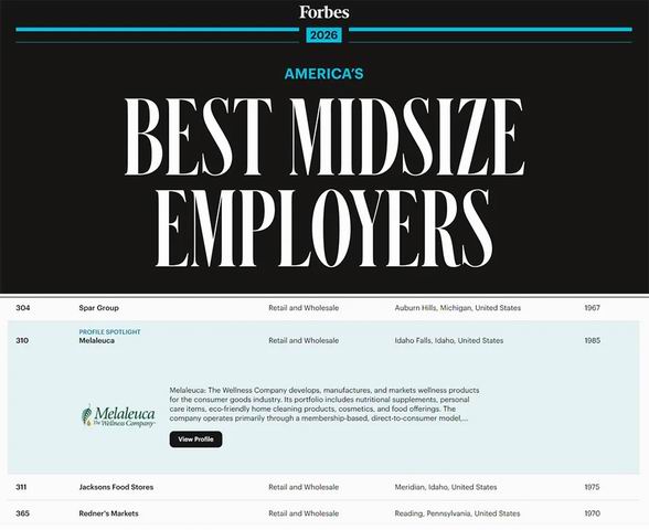 二月底,《福布斯》第四次将美乐家(Melaleuca)评为“中型企业最佳雇主”,在超过20万家中型企业参与的评选中,仅有500家入选了《福布斯》2026年的这一最新榜单,美乐家排名第310位。