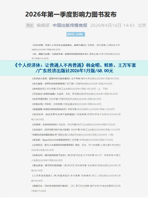 2026年4月16日,《中国出版传媒商报》2026年第一季度影响力书单正式公布,由和治友德韩金明董事长、鲜胜副董事长、个人经济体理论创始人王万军先生联袂撰写的《个人经济体:让普通人不再普通》一书,入选该书单财经类图书榜单。