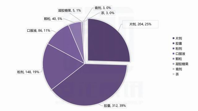 在剂型方面,胶囊(312个)、片剂(204个)、粉剂(148个) 合计占比86.5%。