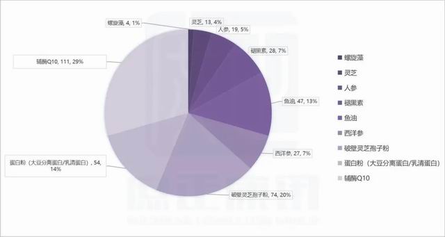 非营养素类产品中,辅酶Q10(111个)、破壁灵芝孢子粉(74个) 、蛋白粉(54个)占据前三。